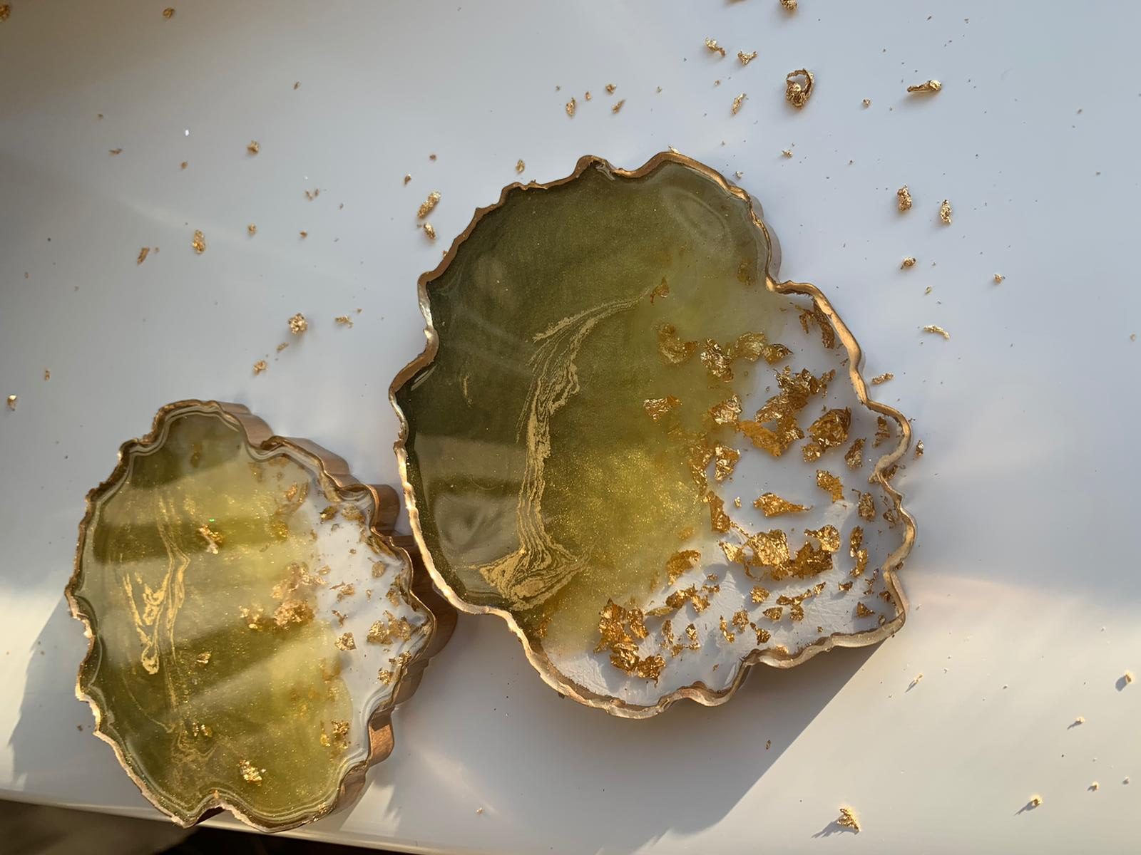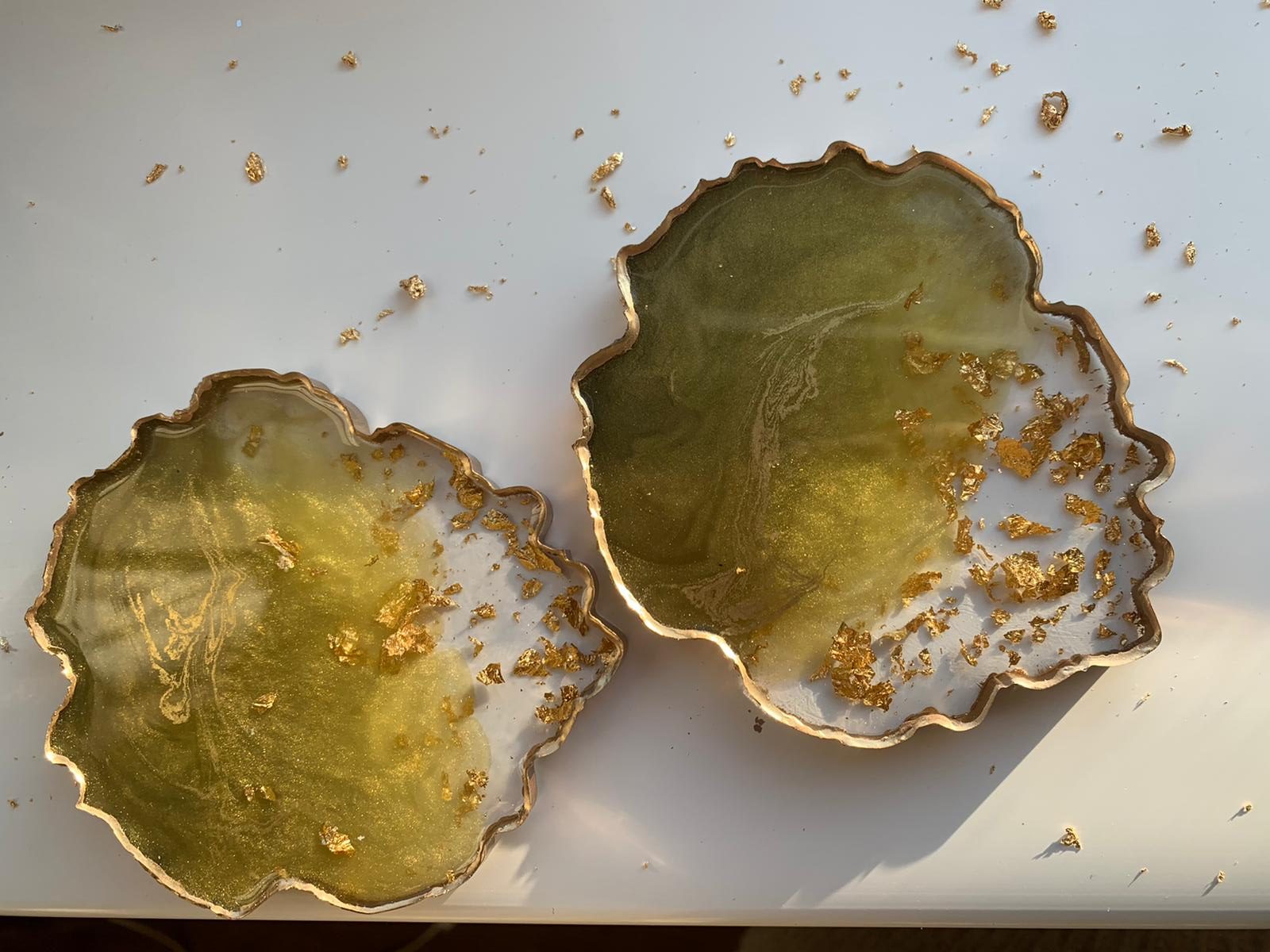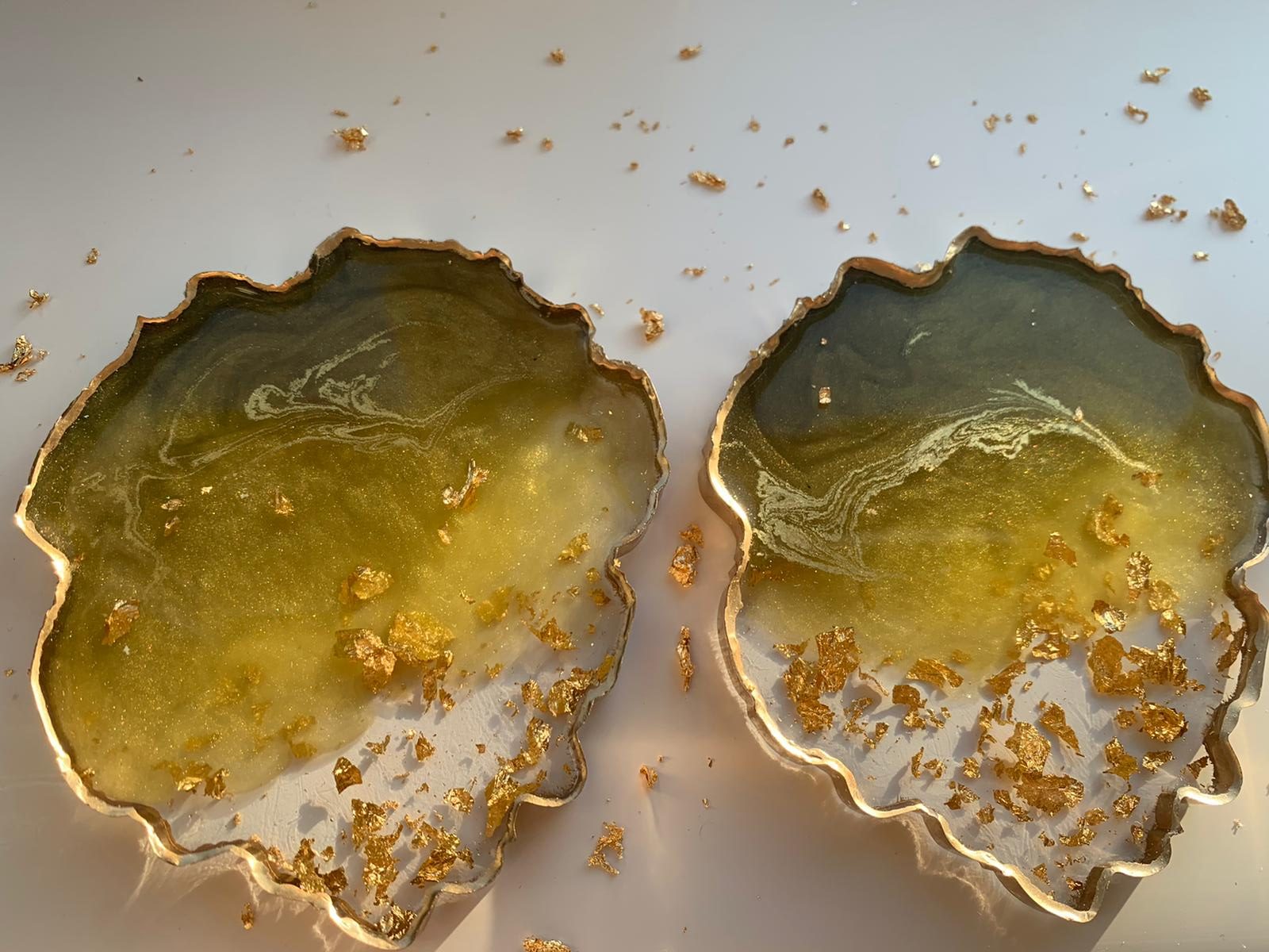 Our beautiful signature Resinio agate coasters come in many variations. All with unique designs and the most exquisite colour combinations that would be an elegant and staple piece to your home. Here we have a coaster set of two beautiful lime and gold coloured coasters, with a blend of gold including the golden gilded edges.