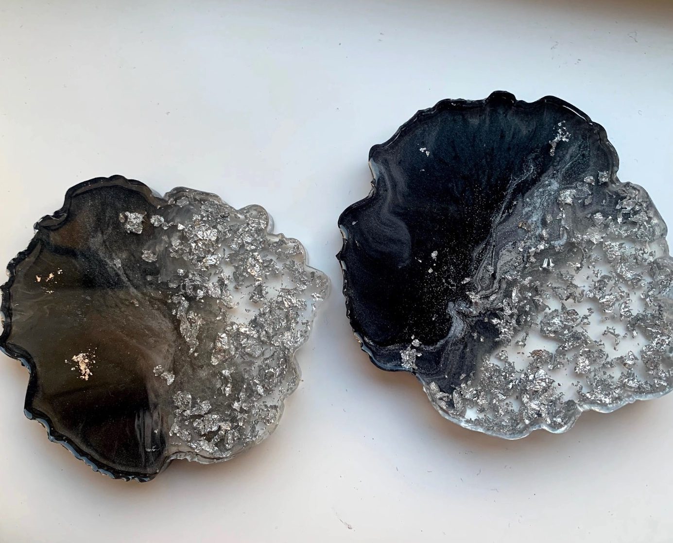 Our beautiful signature Resinio agate coasters come in many variations. All with unique designs and the most exquisite colour combinations that would be an elegant and staple piece to your home. Here we have a coaster set of two beautiful midnight black and silver coloured coasters, with a blend of silver flakes including the silver gilded edges.